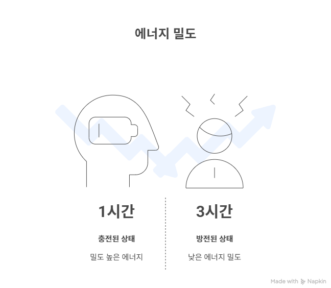 많은 사람이 할 일을 다 끝내고 남는 시간에 쉬려고 합니다. 하지만 저자는 ‘회복’을 스케줄의 0순위에 두라고 조언합니다. 에너지가 바닥난 상태에서의 3시간보다, 잘 충전된 상태에서의 1시간이 훨씬 밀도 높기 때문이죠.