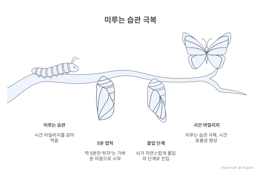 ‘미루는 습관’은 시간 마일리지를 갉아먹는 주범입니다. 저자는 ‘5분 법칙’을 제안합니다. “딱 5분만 하자”는 가벼운 마음으로 시작하면, 우리 뇌는 자연스럽게 몰입의 단계로 진입하게 됩니다.
